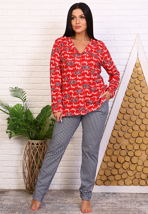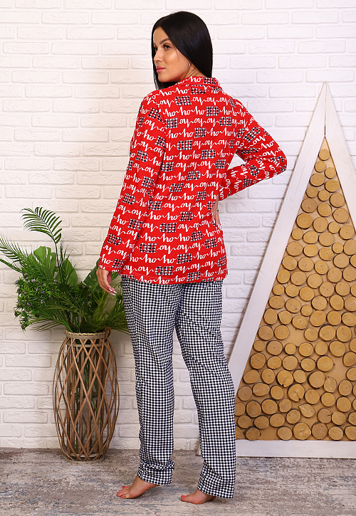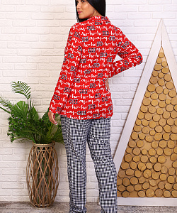 Костюм женский домашний. Кофта на пуговицах, свободного кроя с длинным рукавом. Брюки прямые, имеются карманы. Яркий костюм с новогодней тематикой будет замечательным подарком к наступающим праздникам.