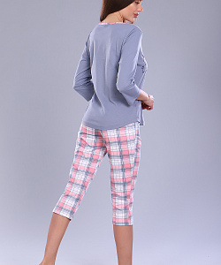 Женский молодежный костюм-пижама, состоящий из футболки с удлиненным втачным рукавом, округлой горловиной, отделанной обтачкой из ткани бриджей и закругленным низом и бриджей на резинке на талии шириной в 3 см. На груди печать в виде зайчиков и надписи "Some Bunny loves you", на бриджах - рисунок по ткани "клетка". Пижама сшита из трикотажного полотна высокого качества, 100% хлопок (кулирка). Бриджи выполнены из ткани, на ощупь напоминающую тонкую фланель. Удобная, мягкая, приятная к телу, не стесняет движения. Нежные, пастельные цвета ткани соответствуют модным тенденциям. Пижама - незаменимый предмет гардероба каждой женщины. Прекрасно подходит для сна и отдыха, а также для ношения, как домашний костюм, для пижамных вечеринок. Принт в виде символа 2023 года делает эту модель актуальным подарком к Новому Году. Отличный подарок для девочек, юных девушек и женщин по любому поводу!