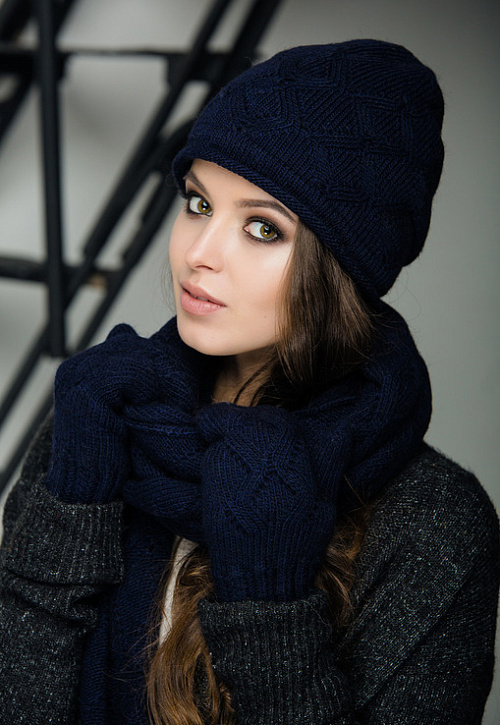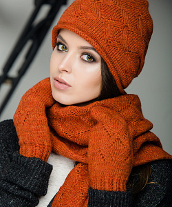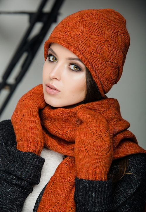 Женская шапка двойной вязки, с фиксированным защипом сзади, шарф ажурной вязки и варежки.