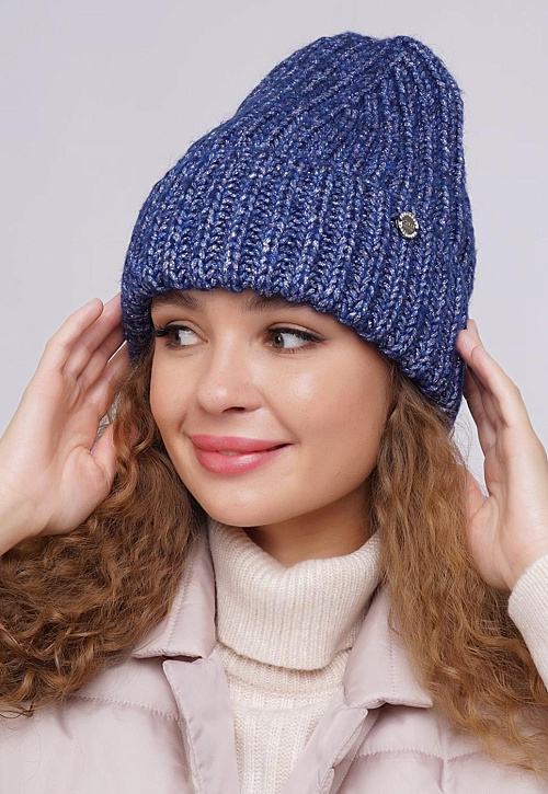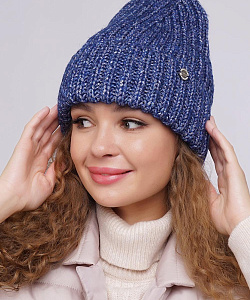 Стильная женская шапка с отворотом, на внутреннем слое в области ушей вывязан дополнительный участок из гипоалергенной пряжи, для более комфортной носки. Изделие выполнено из фасонной пряжи с благородным мерцающим блеском и декорирована логотипом.
