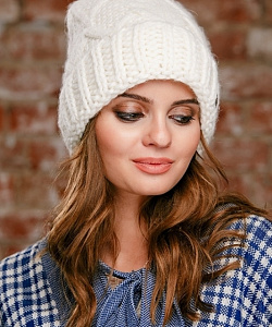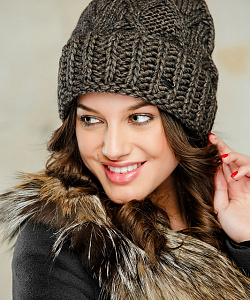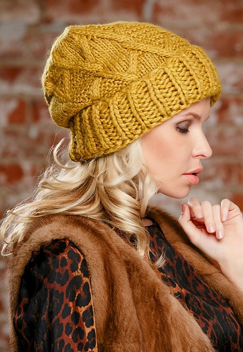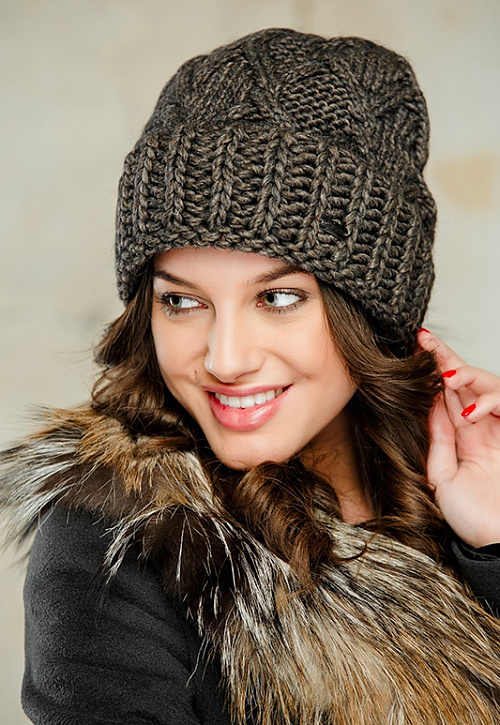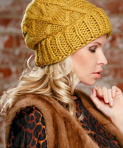 Женственная шапка крупной вязки с широким отворотом. Модель на флисовой подкладке.