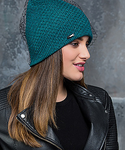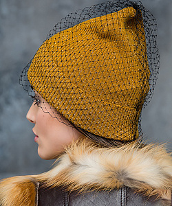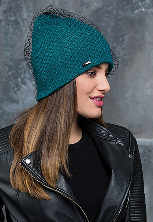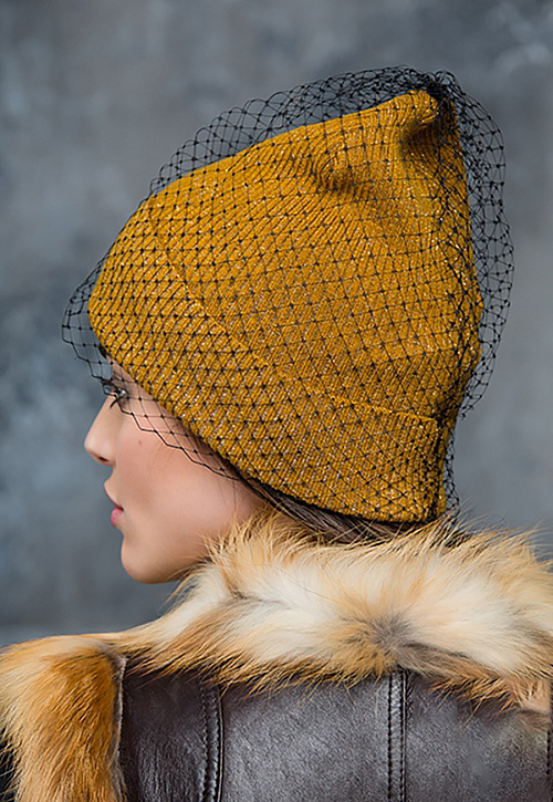 Стильный колпак с отворотом, вязка резинкой. В состав пряжи входит люрекс. Сверху оформлена вуалью.