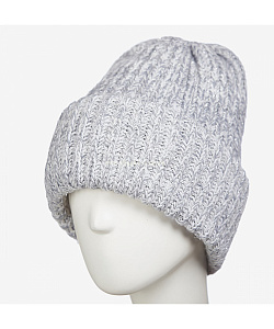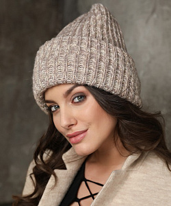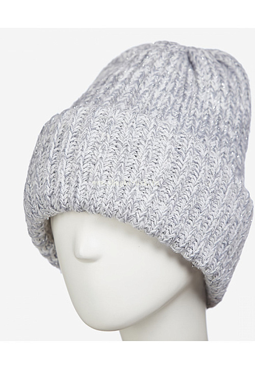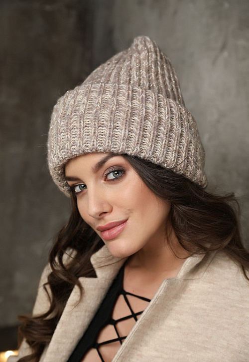 Стильная шапочка с объемным двойным отворотом. Модель выполнена из пряжи с люрексом.