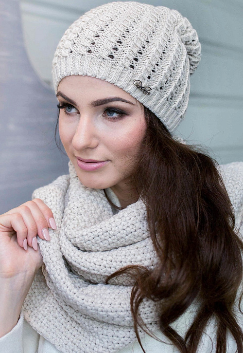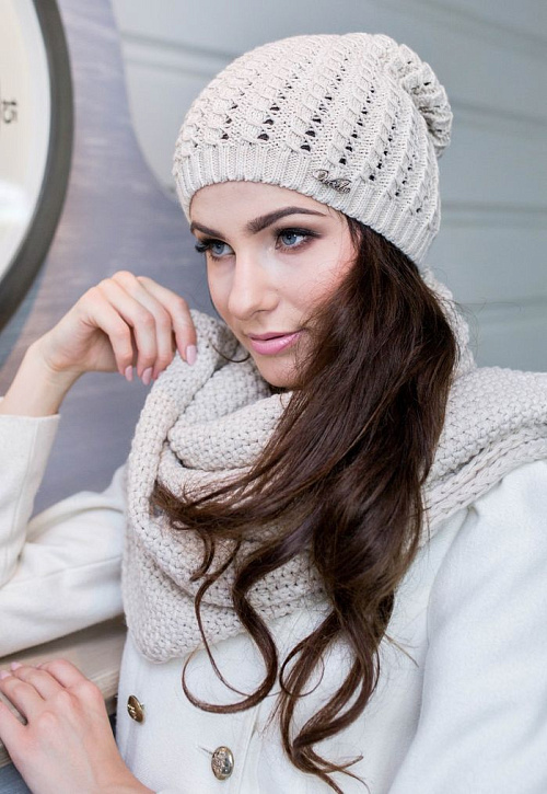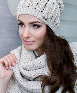 Двойная шапка ажурной вязки. Шапка выполнена из однотонной пряжи с добавлением люрексовой нити, украшена фирменной шильдой на булавке.