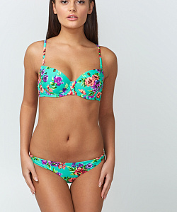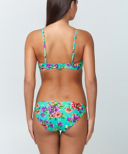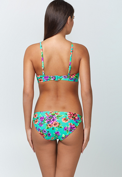 Купальник раздельный, выполненный из принтованной классической купальной ткани. Бюстгальтер формы T-Shirt с формованной чашкой без Push-up для всех размеров. Бретели эластичные, состоят из двух частей. Задние бретели отстегивающиеся, что позволяет застегнуть передние бретели на шее. Трусы классические.