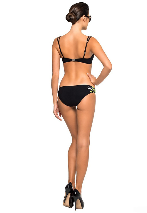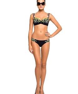 Эффектный раздельный купальник. Бюст на размер С - формованные чашки со съемным корректором на каркасе и усиленным эффектом push-up. Фиксируется элегантными двойными бретелями и застежкой на спине. Плавки комфортной посадки со средним боком. Модель выполнена в лаконичном принте детального расположения и украшена эмалевыми брошками по бретелям и центру бюста.