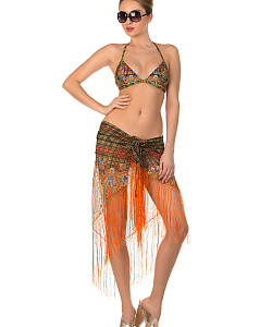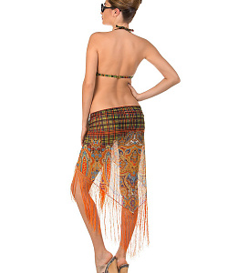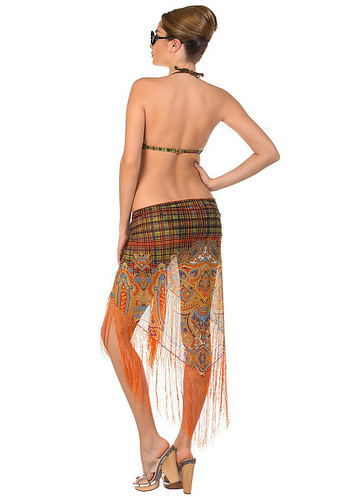 Пляжное парео-шаль треугольной формы, оформленное шелковой бахромой. Эффектный принт в сочетании шотландской клетки и восточного пейсли идеально гармонирует со всеми купальниками коллекции.