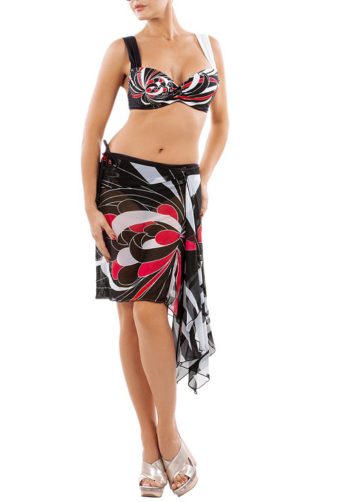 Эффектная пляжная юбка-парео летящего силуэта ассиметричного кроя, пояс на плоских завязках. Модель выполнена из легкой полупрозрачной микросетки, которая приятно холодит кожу под жарким солнцем. Поместный абстрактный принт и детальное серебряное фольгирование на этой модели прекрасно сочетаются со всеми купальниками данной коллекции.
