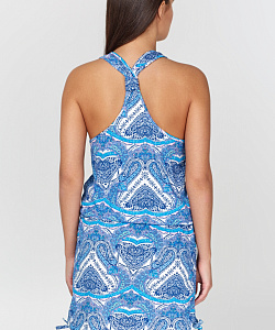 Пляжное платье из эластичного трикотажа с ярким принтом «пейсли», декорированное кулисками по бокам. Модель с V-образным вырезом горловины и поясом на кулиске для обеспечения лучшего прилегания.