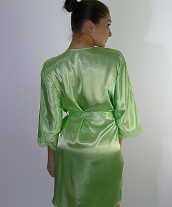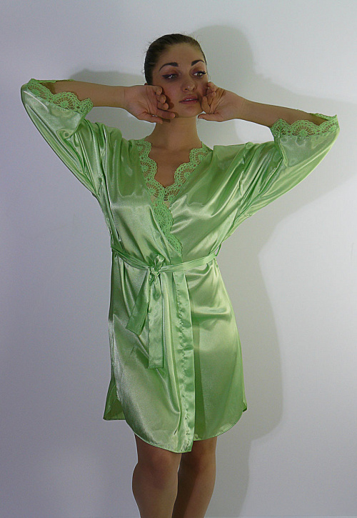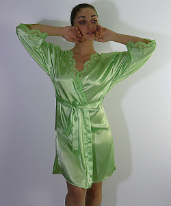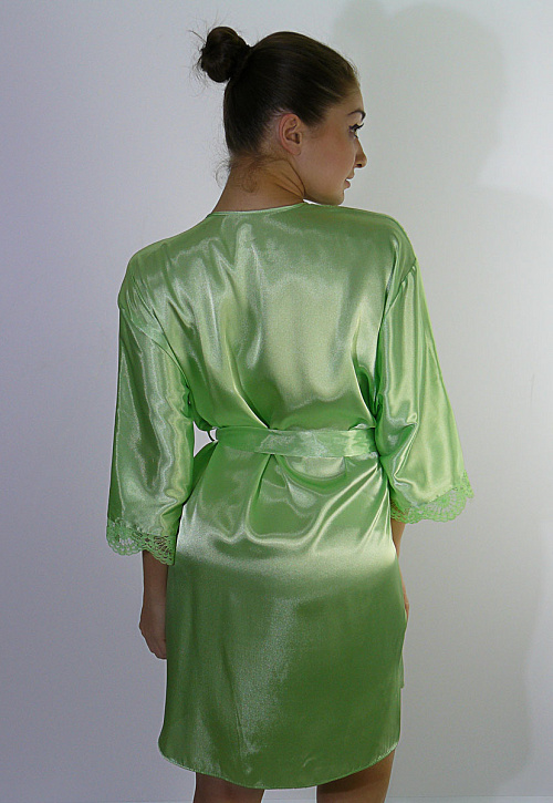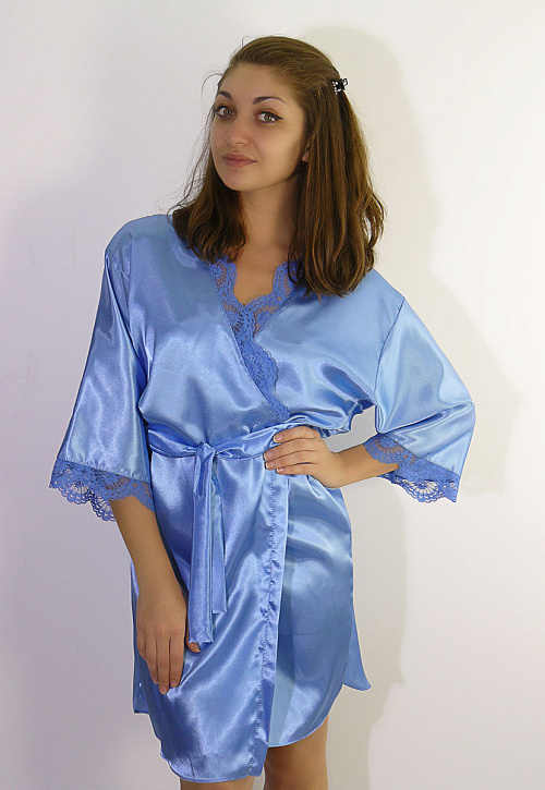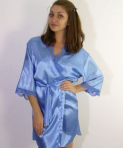 Женский халат с поясом и короткими рукавами. Декорирован кружевом.