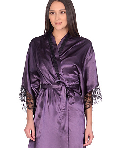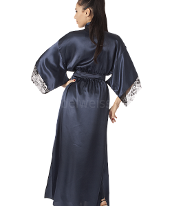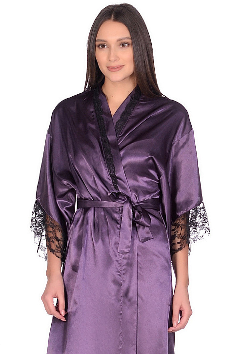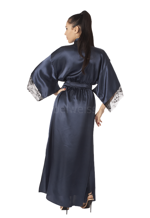 Роскошный длинный халат из искусственного однотонного шелка, прямого силуэта, с запахом под пояс. Рукава широкие, длиной три четверти, с удлинённой проймой, по низу отделаны изысканным ажурным кружевом с фестонами. Спинка со сборкой по талии с притачным поясом. По бокам высокие разрезы. Линия горловины декорирована узким кружевом.
