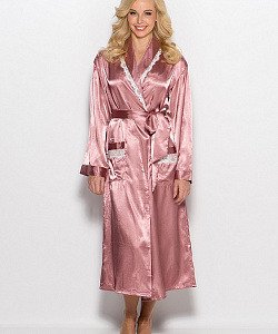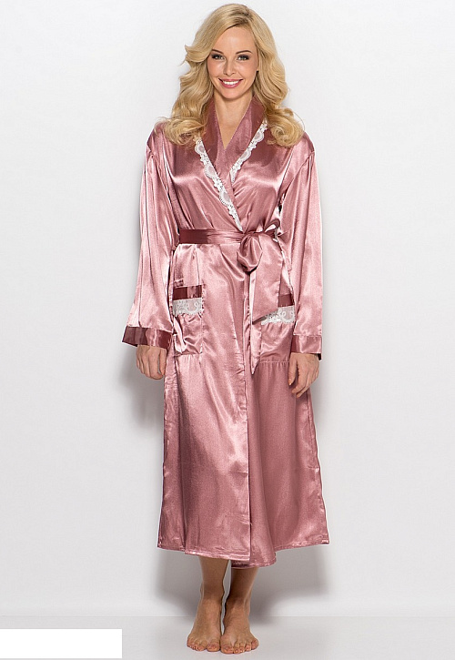 Халат MiaMia длинный с накладными карманами.Отложной воротник и карманы оторочены швейцарским кружевом высокого качества. Ткань- шелк-сатин высокого качества, максимально приближенный по органолептическим свойствам к натуральному шелку.