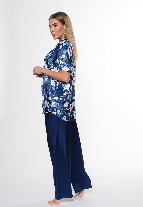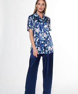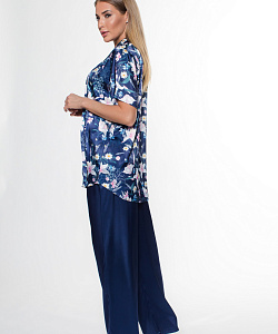 Домашняя пижама из нежного сатина для пышных красавиц. Верх — жакет на пуговицах с коротким рукавом, V-образным вырезом и воротничком. Низ: широкие брюки свободного прямого кроя на мягкой резинке. Ткань жакета темного цвета с флористическим принтом в виде лилий, брюки однотонные. Костюм легкий, практичный, удобный, не тянется.