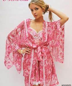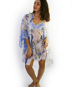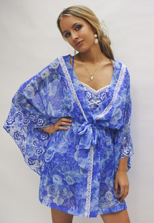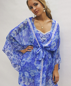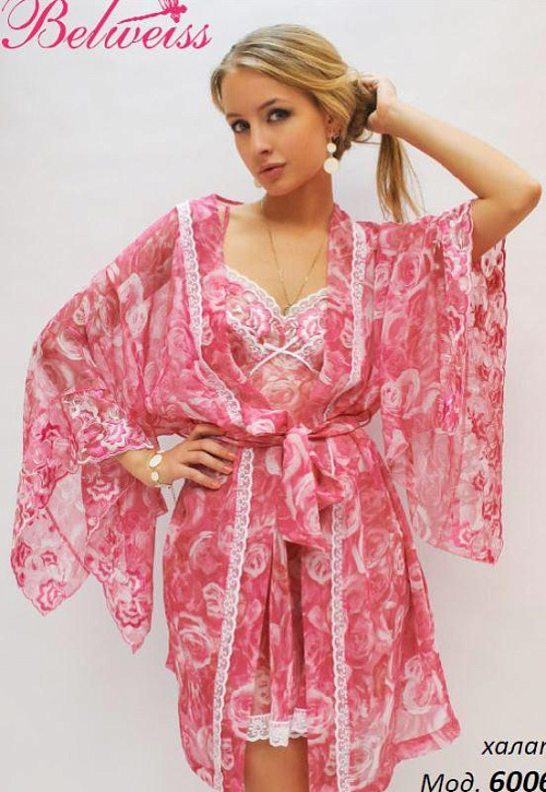 Короткий пенюар из тонкого, легкого, воздушного шифона. Свободный, летящий силуэт модели обеспечит комфорт.