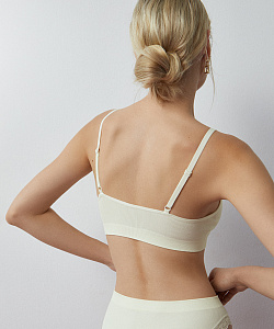 Комфортный топ в рубчик на тонких регулируемых бретелях со съемными формованными вкладышами. Подчеркивает естественную форму груди. Верх лифа обработан ажурным кружевом с изящным цветочным рисунком. Изготовлен по бесшовной технологии Seamless из мягкой микрофибры, которая отлично пропускает воздух и обладает нежной текстурой. Топ превосходно облегает и приятно ощущается на теле благодаря отсутствию боковых швов. Хорошо сохраняет форму и цвет. Удобная вывязанная резинка обеспечивает надежную поддержку. Элегантный и женственный топ можно носить и в качестве нижнего белья и как трендовый элемент бельевого стиля.
