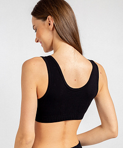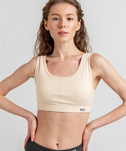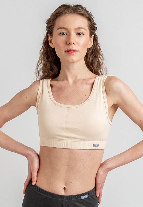Удобный женский топ без боковых швов. Полотно из хлопка с эластановой нитью прекрасно облегает фигуру. На груди двойной кармашек для размещения формообразующий вкладок. Прост в уходе и долговечен благодаря переплетению кулирная гладь.
