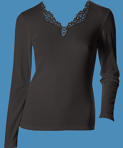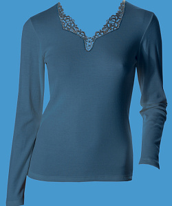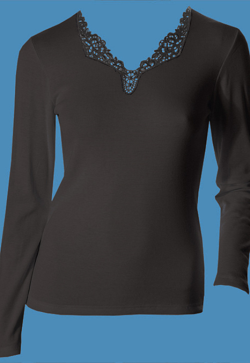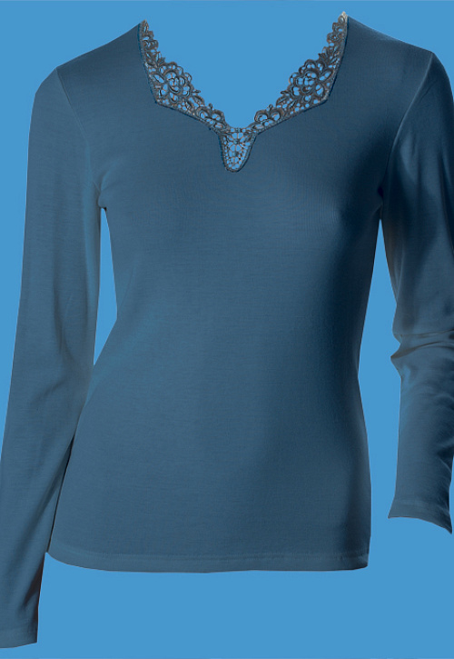 Женская футболка с длинным рукавом Comazo 1_59_35030. Форма выреза горловины подчеркнута кружевной тесьмой. Тонкое эластичное полотно из шерсти и акрила. Футболка с таким составом легкая и теплая, позволяет телу дышать и проветриваться. Модель совершенно без боковых швов. А это значит максимальный комфорт при носке.