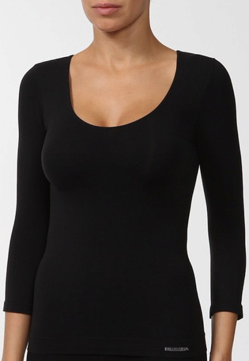 Бесшовная футболка с рукавами 3/4 и глубоким овальным вырезом, выполненная из мягкой микрофибры.