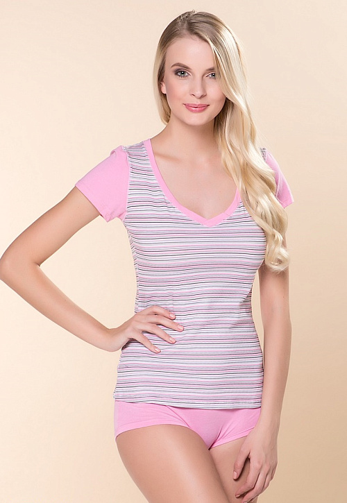 Этот комплект состоит из футболки с коротким рукавом и миниатюрных шортиков. Комплект выполнен в нежных оттенках розового, а футболка украшена мелкими полосочками. Такой комплект может служить как пижама или просто домашняя одежда. Натуральные ткани и качественная обработка швов сделают Ваш досуг комфортным.