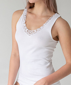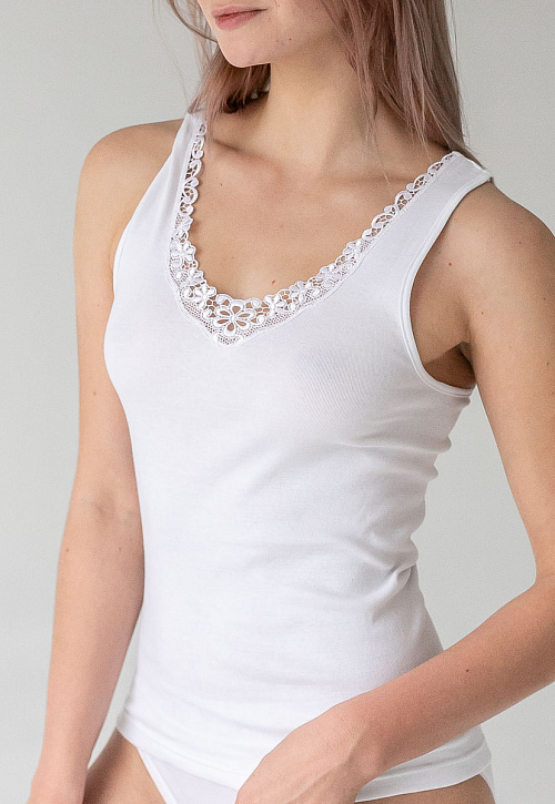 Женская хлопковая майка без боковых швов на широкой бретельке. Майка мягко прилегает к телу и дарит ощущение комфорта. Вырез спереди оторочен элегантным европейским кружевом.