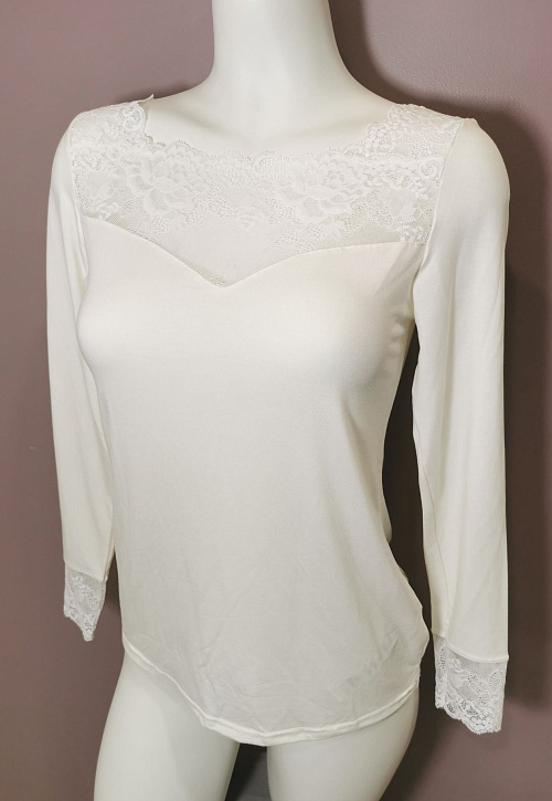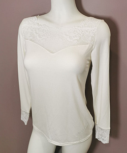 Кофта из эластичной вискозы с длинным рукавом и вырезом "лодочка". Верхняя часть модели и манжеты выполнены из эластичного кружева.