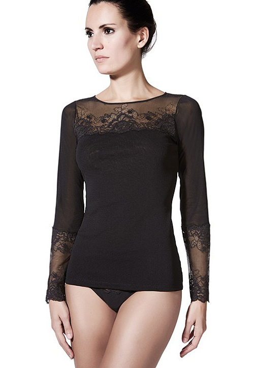 Кофта из плотной эластичной ткани с длинным рукавом и вырезом *лодочка*. Верхняя часть модели и манжеты выполнены из эластичного кружева.
