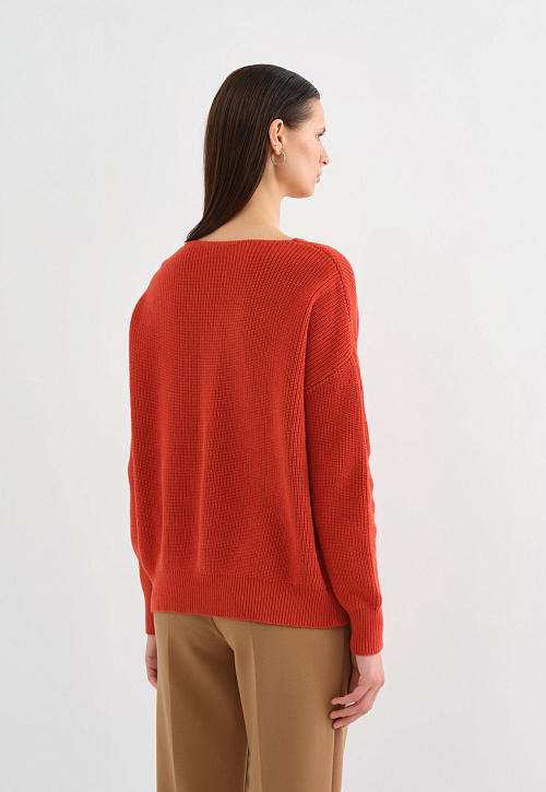Этот пуловер станет идеальным компаньоном нестрогих деловых и casual-образов. Комфортный свободный крой и спущенная линия плеча – для оптимальной посадки. Можно носить соло, а также надеть под низ однотонную блузку или футболку. Модель из 100% хлопка, при этом фактурная вязка резинкой придает модели эластичность и уютный объем.