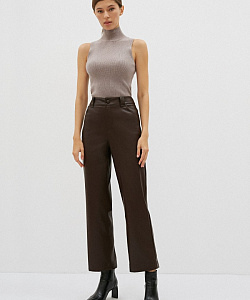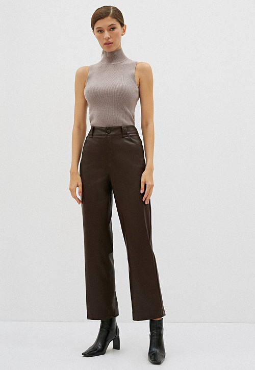 Актуальный топ прилегающего силуэта с высоким воротом-стойкой без рукавов. Выполнен из тонкого эластичного трикотажа рельефной вязки в мелкий рубчик. Можно носить изделие самостоятельно, комбинируя с костюмами, юбками и брюками либо накидывать сверху пиджак, болеро, жакет или кардиган..