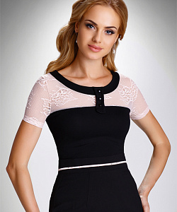 Блузка с короткими рукавами, круглый вырез, верхняя часть изделия декорирована кружевом.