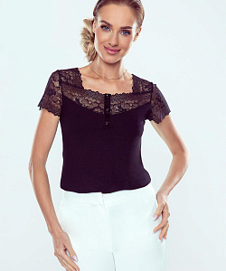 Элегантная блузка с коротким рукавом и аккуратным квадратным вырезом. Зона декольте и рукава модели выполнены из кружева с цветочным узором. На верхней части фронта блузки размещены декоративные пуговицы.