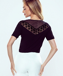 Элегантная блузка с коротким рукавом и каплевидным вырезом, декорированным объемным кружевом с цветочным узором.