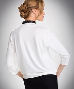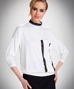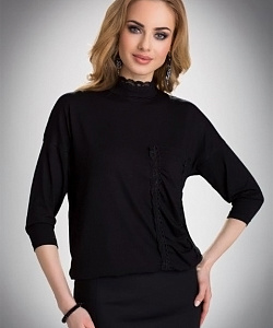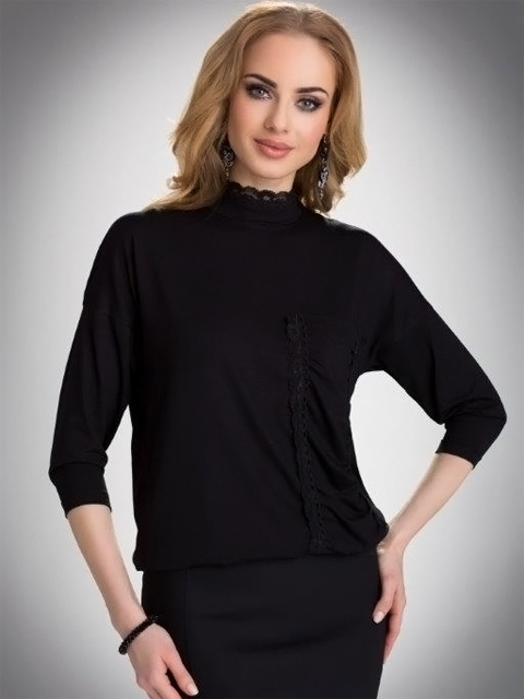 Элегантная блузка с воротником-стойкой и рукавами 3/4, свободный крой, на фронте глубокий карман с кружевной отделкой.