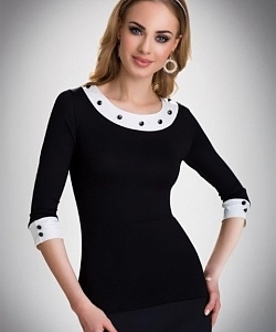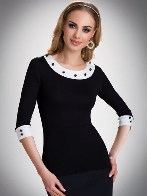 Элегантная блузка с круглым вырезом и рукавами 3/4, манжеты и ворот отделаны контрастными трикотажными вставками с декоративными пуговицами.
